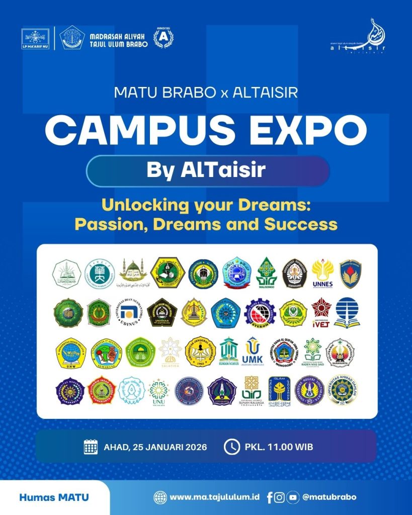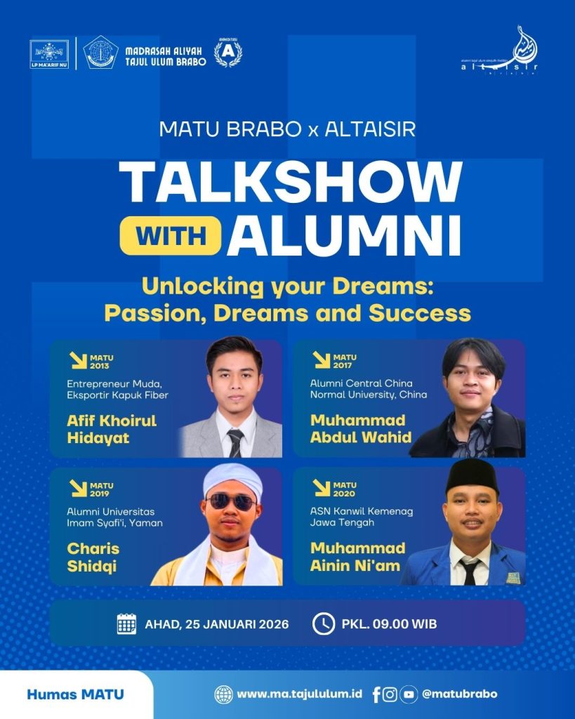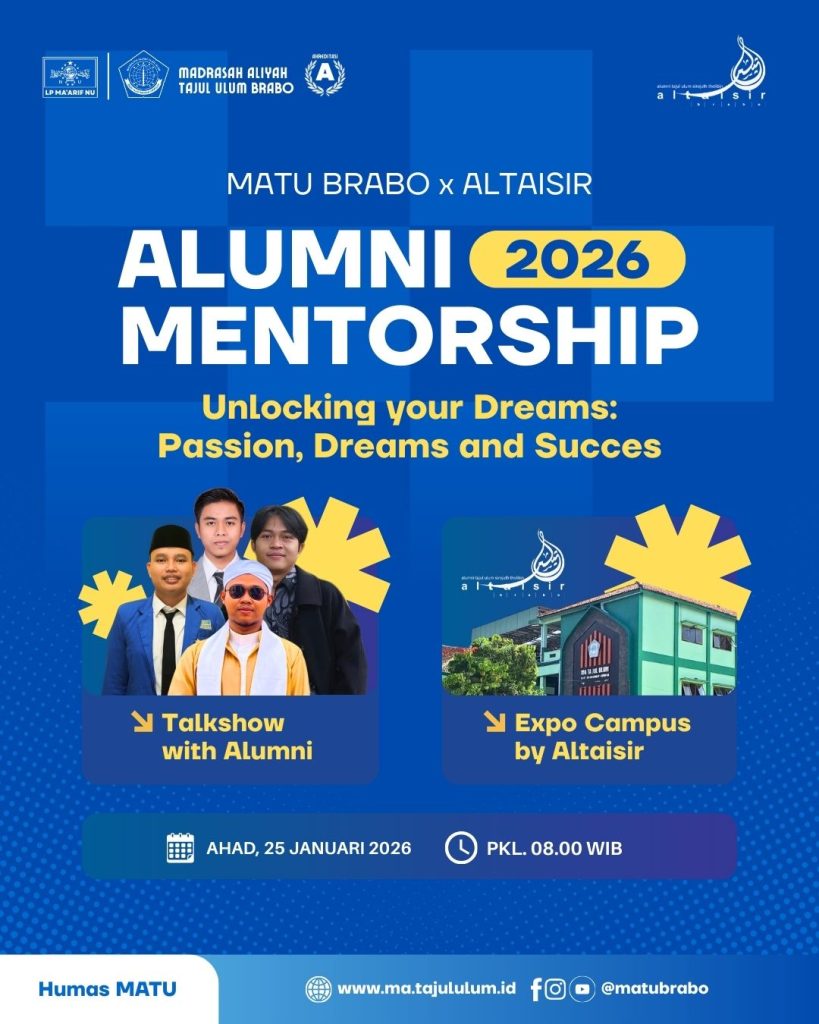 Brabo, ma.tajululum.id – Dalam rangka mendampingi dan memberikan arah masa depan kepada siswa kelas XII, MA Tajul Ulum Brabo akan mengadakan agenda Alumni Mentorship 2026 dengan tema Unlocking your Dreams: Passion, Dreams and Success. Agenda ini akan dilaksanakan pada Ahad (25/1/2026) dengan dua agenda utama: Talkshow with Alumni dan Campus Expo.