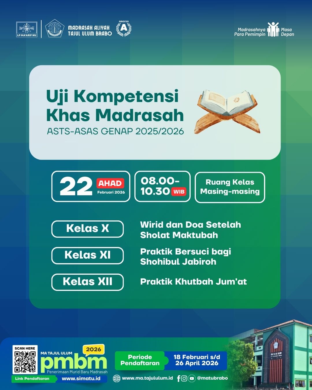 Read moreINFORMASI PENERIMAAN MURID BARU MADRASAH (PMBM)MA TAJUL ULUM BRABO TAHUN AJARAN 2025/2026Brabo, Tanggungharjo, Grobogan 58166, Jawa Tengah Berikut beberapa informasi penting seputar…
