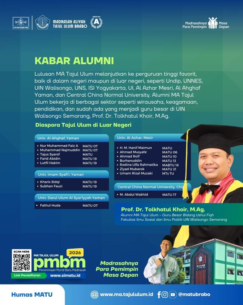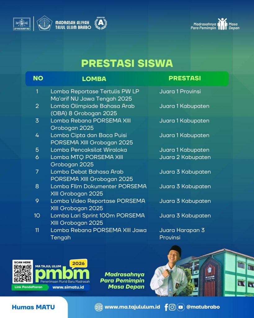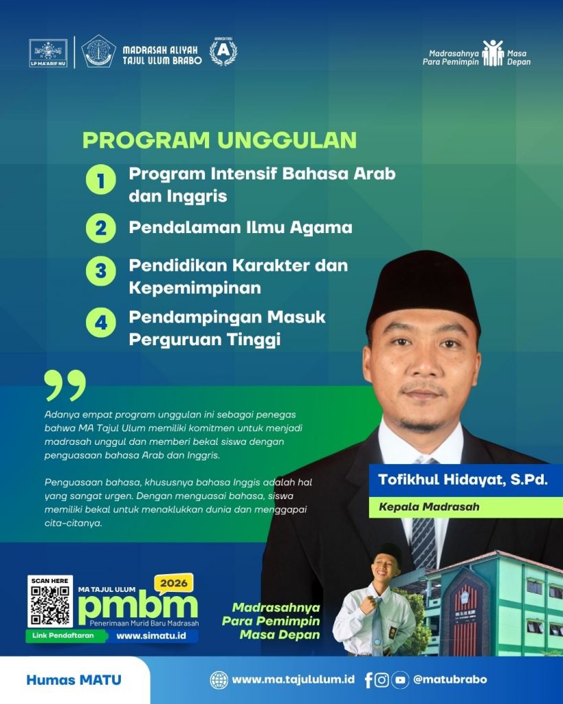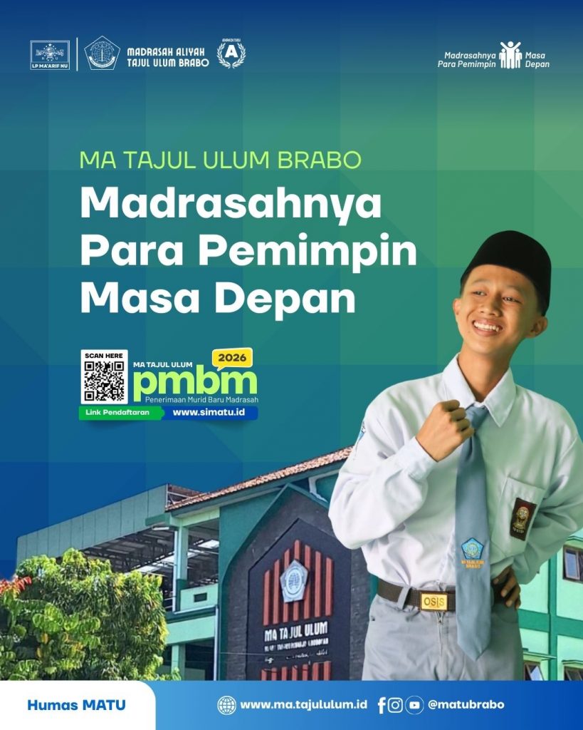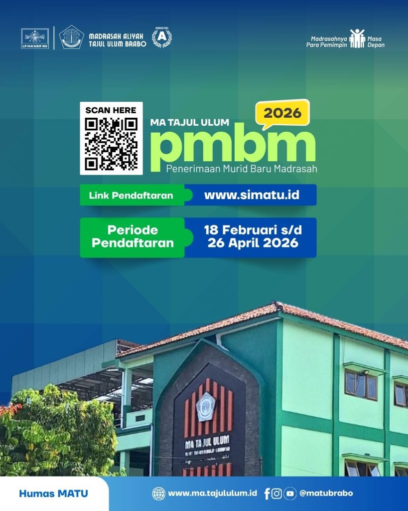 1. PMBM MA Tajul Ulum Brabo dibuka pada Tanggal 18 Februari – 26 April 2026